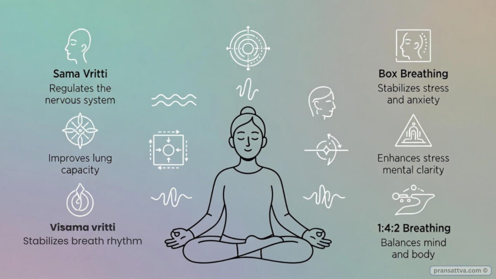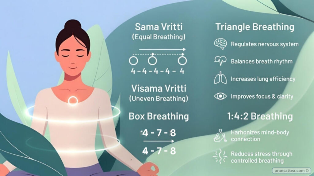 These pranayamas use controlled breath counts — such as equal breathing or structured inhale-hold-exhale cycles — to stabilize the mind and relax the body.