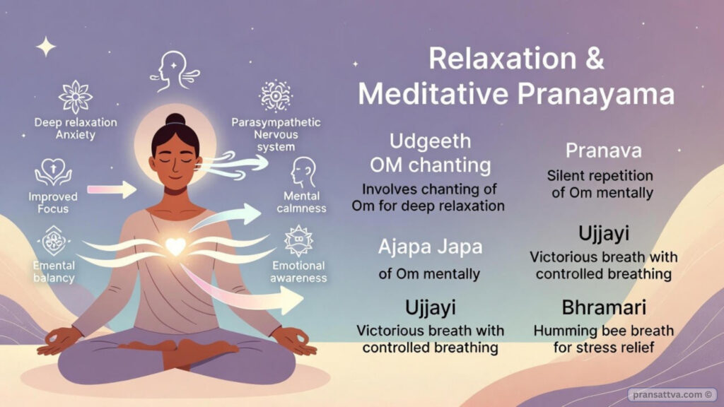 These pranayamas focus on slow breathing, sound vibration, mantra repetition, and mindful awareness.